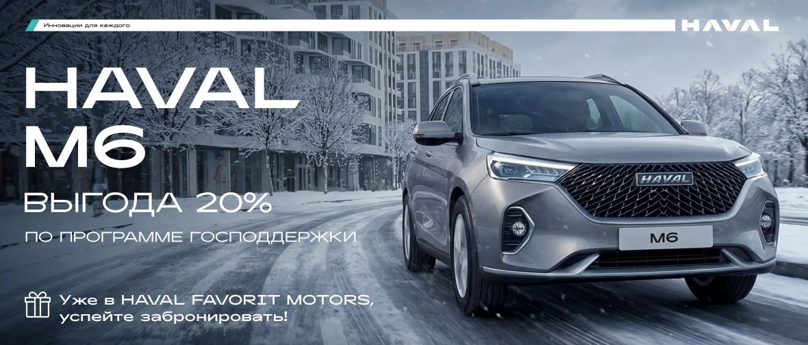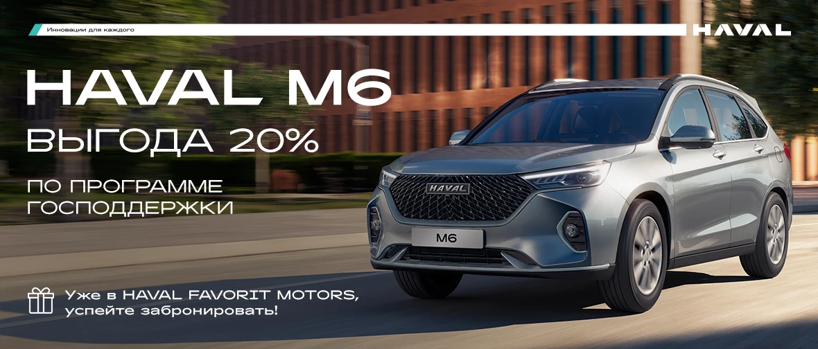 * Выгода в размере 20% от стоимости автомобиля в рамках государственных программ льготного автокредитования может предоставляться гражданам Российской Федерации, которые: являются сотрудниками медицинских организаций государственной системы здравоохранения; либо являются работниками государственных и муниципальных образовательных организаций; либо являются мобилизованными и военнослужащими по контракту, принимающими или принимавшими участие в специальной военной операции, а также членами их семей, либо являются лицами, имеющими инвалидность. Выгода в размере 10% от стоимости автомобиля в рамках государственной программы льготного автокредитования «Семейный автомобиль» может предоставляться гражданам Российской Федерации, которые имеют двух и более несовершеннолетних детей (кроме региона ДФО). Выгода в размере 25% от стоимости автомобиля в рамках государственной программы льготного автокредитования «Семейный автомобиль» может предоставляться гражданам Российской Федерации, которые зарегистрированы и проживают в ДФО, а также имеют одного или более несовершеннолетних детей. Предложение ограничено. Не является офертой и действует в отношении модели HAVAL M6, произведенной после 28.08.2025, стоимостью до 2 млн. руб. Подробности уточняйте у официальных дилеров HAVAL и у Банков-участников программы льготного автокредитования с государственной поддержкой.